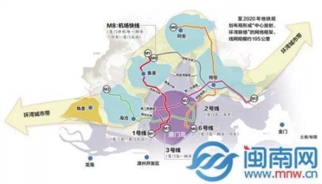 地铁建设目前是厦门交通建设的重中之重。《规划》阐明,至2020年厦门地铁规划布局形成“中心放射、环湾联络”的网络框架,线网规模约195公里。其中,除了已知的厦门地铁1号线、2号线、3号线外,还新增了6号线和机场快线,而岛外环线4号线并未进入本次方案。