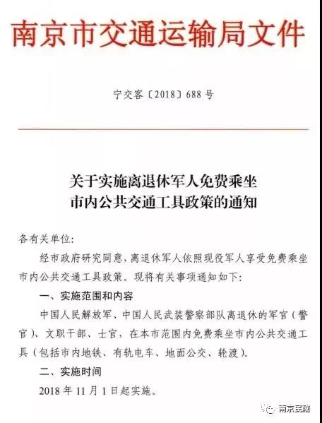 今天从南京市双拥办了解到,本月18日南京市交通运输局发文:从11月1日起,离退休军人也可以和现役军人一样,在南京免费乘坐市内公共交通工具了。在南京范围内,可持本人部队离退休证件,可免费乘坐市内公共交通工具,包括市内地铁、有轨电车、地面公交、轮渡等。