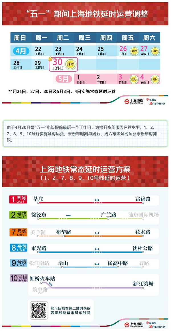 2019年“五一”劳动节法定节假日为5月1日(周三)至5月4日(周六),共四天,其中,4月28日、5月5日调整为工作日,小长假期间,毗邻景点及商圈的地铁客流或将大幅增长。同时,5月份本市重大赛事、活动较多,国家会展中心展览活动也持续开展。为满足节日及活动、会展期间乘客出行需要,确保“五一”劳动节及近期大型活动、展会期间地铁运营安全、有序,运营方特制定了专项方案,提升保驾等级,优化备车投用,全力确保地铁出行的平安顺畅。 提升保驾等级 优化备车投用 4月30日为小长假前最后一个工作日,受天气晴好,以及通勤学生流、假日休闲流叠加等综合因素的影响,预计上海地铁全网客流有望超过1230万人次,当天早高峰时段及晚高峰时段至运营结束,上海地铁路网将全面提升保驾等级。