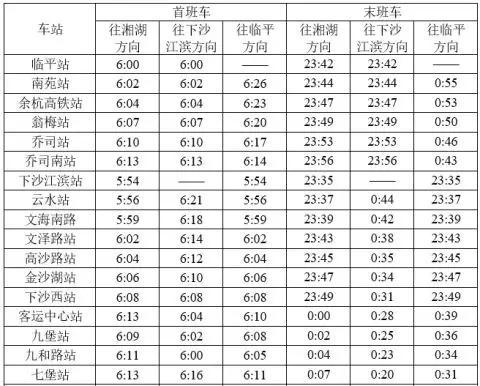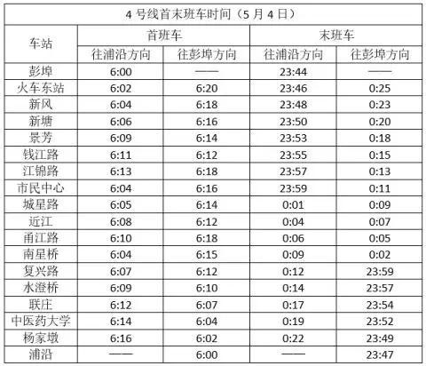 4号线首末班车时间(4月30日、5月1日,延时半小时)