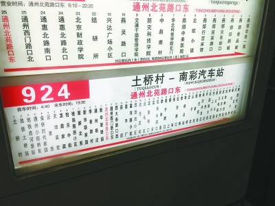 小张指了指924路的站牌,上面显示,从始发站土桥村发出的末班车时间为晚7点30分,按照正常路况,到达通州北苑路口东站的时间大约是晚8点。有时路上稍微堵点车,到达时间会再晚点。“但谁知道它会不会堵车呢?只能赶在8点前过来。”