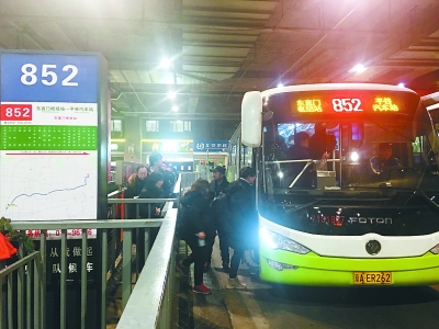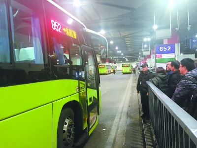 站台工作人员介绍,852路车上总共有50多个座位,一班车差不多坐满就会发车。在延长的这半个小时中,大约能多发出六到七班。也就是说,现在852路每天能多让两三百人享受到回家的便捷。