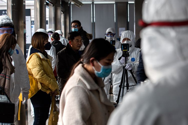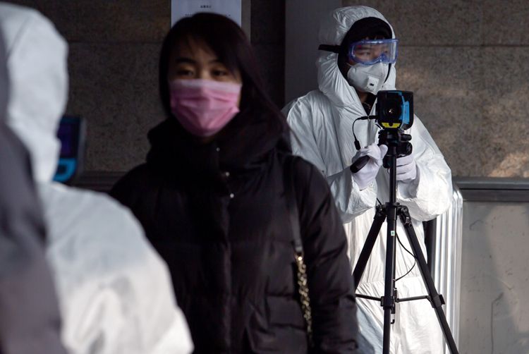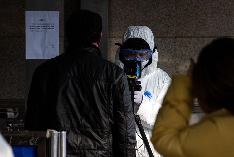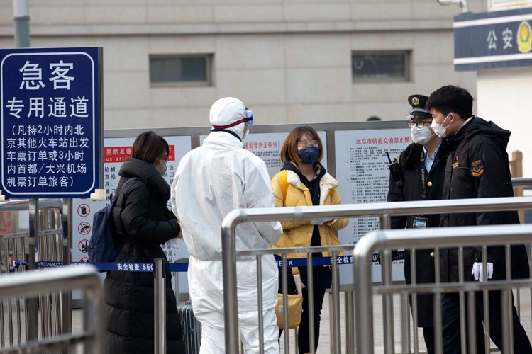 地铁北京站安检口,安检人员测量进站旅客体温。