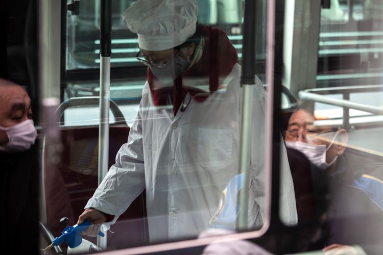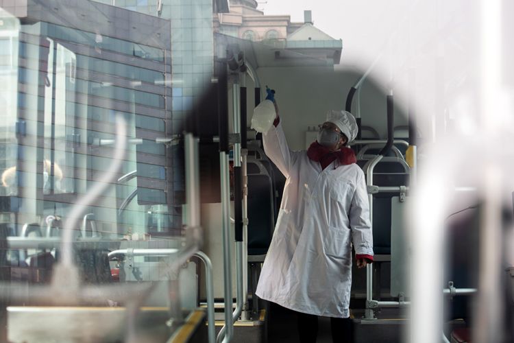 北京站东侧的公交场站,工作人员使用消毒液对公交车进行消毒。