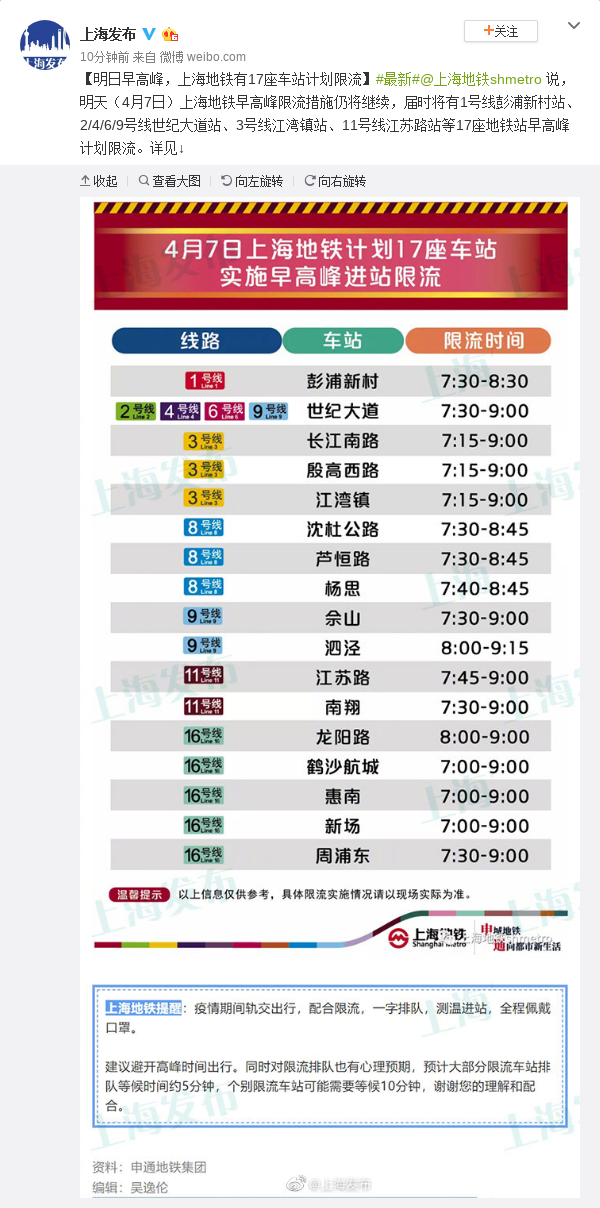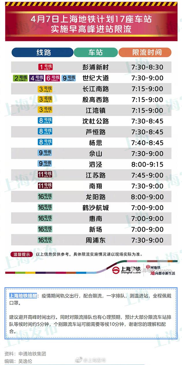 @上海地铁shmetro 说,明天(4月7日)上海地铁早高峰限流措施仍将继续,届时将有1号线彭浦新村站、2/4/6/9号线世纪大道站、3号线江湾镇站、11号线江苏路站等17座地铁站早高峰计划限流。详见↓