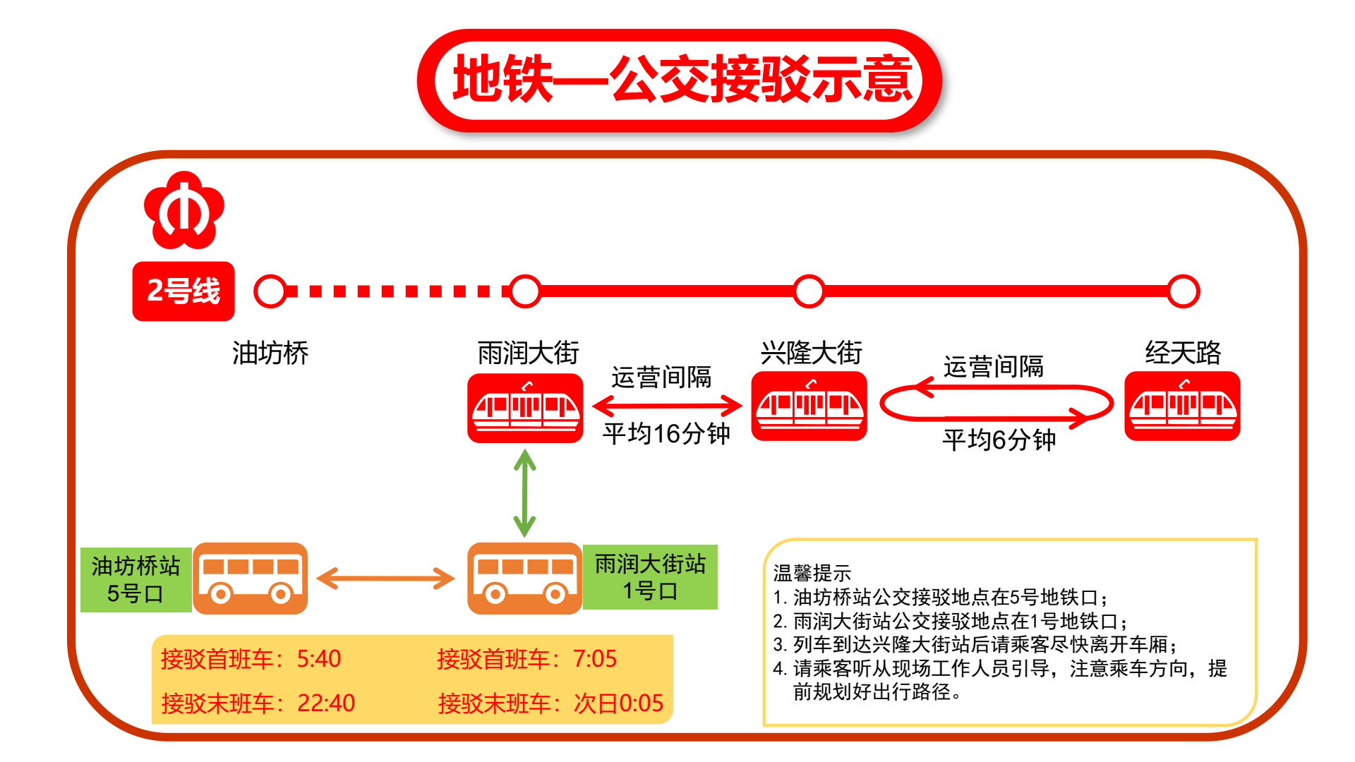 南京地铁将根据施工期间相关要求提前部署行车及客流组织保障措施,配合市公建中心完善油坊桥站至雨润大街站公交车接驳相关方案,根据客流情况灵活调配运力疏导客流,以保障影响区段居民的公共交通出行。 施工期间2号线行车组织调整为:2号线油坊桥站关闭,油坊桥站至雨润大街站采取公交接驳;雨润大街站至兴隆大街站采取单线双向运营,行车间隔16分钟;兴隆大街站至经天路站采取小交路运营,行车间隔6分钟。南京地铁线网其他线路正常运营。 施工期间,油坊桥站接驳公交设置在该地铁站5号出入口,服务时间为5:40~22:40;雨润大街站接驳公交设置在该地铁站1号出入口,服务时间为7:05~次日0:05。 南京地铁提醒广大乘客留意并提前做好“五一”假期的出行安排,可选择通过地铁南京南站换乘绕行、公交接驳或其他交通方式出行,以免延误行程。