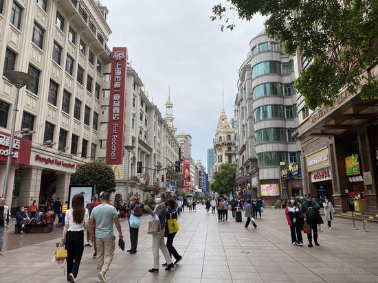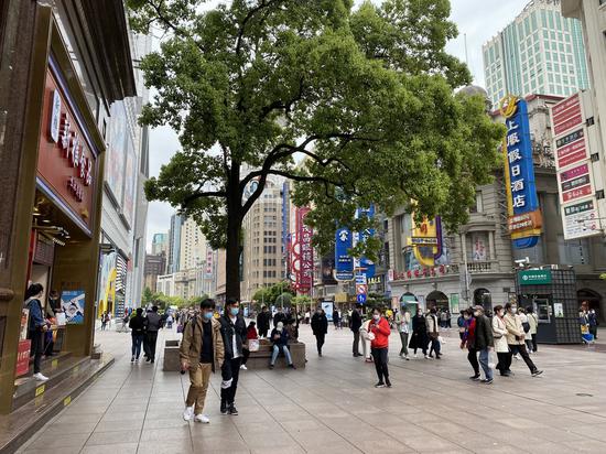 4月底,地铁站出来步行5分钟就能到达的东发道茶餐厅,已回复了去年八成火爆。 这家网红餐厅去年最鼎盛时要排队7-8个小时,一天卖掉500多份招牌菜豉油鸡。但3月15日复工后,也曾经历“随到随吃”的冷清。 4月27日中午,食客们保持间隔距离,又在东发道前排起了队。面对顾客询问,店员告知“等位时间不确定”后,就忙着招呼后边的取号客人。记者也取了个号——两人桌前有67桌在等位。 “很久不聚,想找家网红店搓一顿”的王女士特意乘地铁前来,一小时的排队她不觉得长,“高于心理预期”。店长则很肯定地告诉记者,店铺不再要媒体宣传,“人已经很多了。” 在人民广场站周围,重新排起长队的“鲍师傅”、人流恢复八成的迪美美食街,无不在诉说着热闹重现。 南京东路步行街重聚人气。